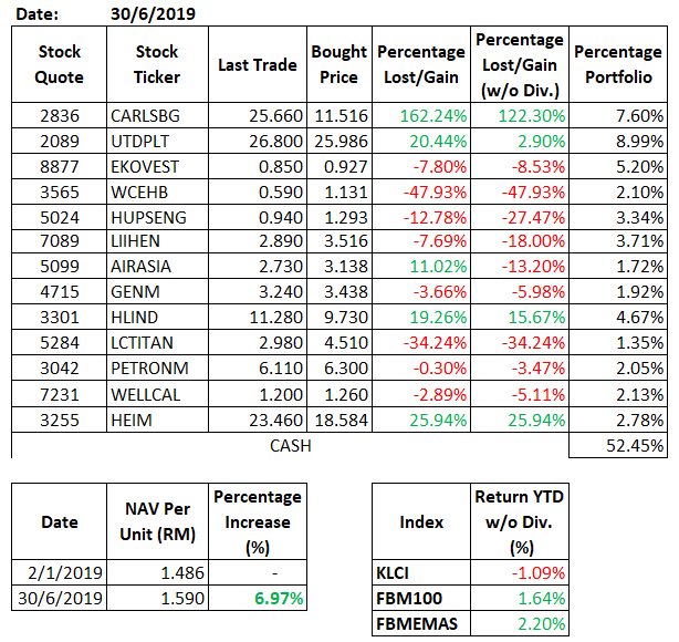 It is the end of the year and I did not have much time to post because I am entering a new phase of my life. I will post more frequently from February onward. This will be a short post to update my portfolio position on this blog. In FYE2019, my portfolio increase by 10.36% while KLCI index drop by -6.02%, FBM100 index drop by -2.88% and FBMEMAS index drop by -1.77%.